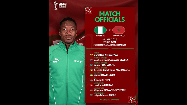 Organisers of All African Cup of Nations, Confédération Africaine de Football (CAF), has appointed Ghanaian referee Daniel Laryea to officiate African Cup of Nations semi-finals game between Nigeria and host country, Morocco.