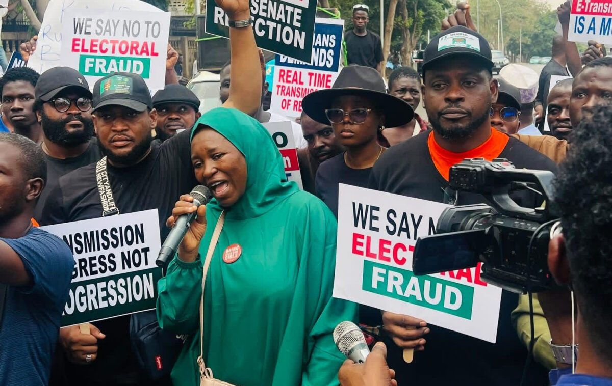 The protesters, led by activist Aisha Yesufu and a popular street demonstrator known as ‘flag boy,’ marched through the streets of Abuja carrying placards with several inscriptions, such as “Say No To Electoral Fraud,” “We Reject The Senate’s Rejection,” “Akpabio, E-Transmission Is A Must,” and “Transmission Is Progress, not Retrogression,” among others.