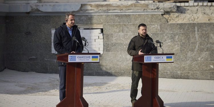 Mitsotakis and Zelensky met in Odesa and toured an apartment building where 12 people died on Saturday in a missile strike. They chose Odesa in part because the city has historical significance for Greece — the architects of the Greek War of Independence from the Ottoman Empire met in the port city to plan their uprising.